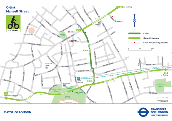 Consultations have now launched into the scheme on Mansell Street and the CS8 route between Lambeth Bridge and Chelsea Bridge.Investing in walking, cycling and public transport is critical to the sustainability and success of the capital’s economy and the wider UK economy.Transport for London (TfL) has completed work on a new protected cycle route in east London, which will enable thousands of safer cycling journeys across London each week. The new route will help to build on the huge increases in cycling seen in the capital since the start of the coronavirus pandemic. Enabling more people to walk, cycle and use public transport is critical to a successful and sustainable economy in London, which is vital for the success of the wider economy. On Mansell Street in Aldgate, work has been completed to connect two major existing Cycleways on London’s high-quality network of routes – Cycleway 2 and Cycleway 3. The changes are a vital new part of the network in east London, opening up a new corridor for safer, protected journeys stretching from Stratford in the east to Lancaster Gate in the west. Changes that have been put in place as part of the work include: A two-way cycle lane on Mansell Street, using cycle wands to separate people cycling from motor traffic