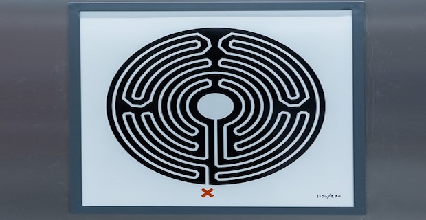 Inspired by the language of the symbols of London Underground, Wallinger chose the ancient symbol of the Labyrinth, with its single path, as the theme of the expansive work. Each London Underground station has its own unique Labyrinth design, emblazoned in black and white on a single 60cm² enamel panel, representing the journey through the network taken by millions of individuals each year. The works are installed in prominent positions so that they are visible to the most amount of people, and alongside the unique Labyrinth design, each has a number marked out of 270, the number of London Underground stations in 2013. The original numbering referred to the Tube Challenge route - the optimum route to pass through all stations on the London Underground network in the fastest possible time – as set when the work was fabricated.