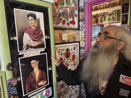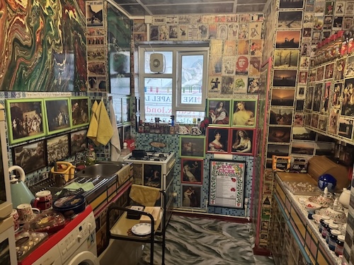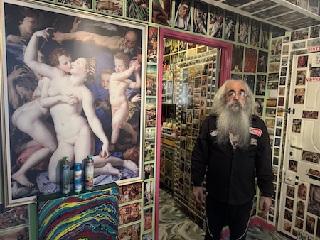 After his parents died, he began turning his home into a living art installation withi every surface covered with his acrylic paintings, his collection of dolls and other ephemera, and reproductions of major artworks.