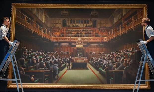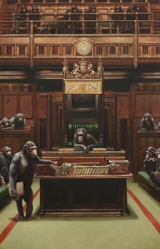 Banksy first unveiled the painting, then titled Question Time, a decade ago as part of his ground-breaking Banksy vs. Bristol Museum exhibition, which famously drew over 300,000 visitors to become one of the world’s top ten most-visited shows of 2019. The painting has since been reworked by the artist and more recently retitled. Once glowing, the Commons’ lamps have been snuffed-out by Banksy, while the upturned banana of an ape in the foreground now faces downwards; in addition to these and other subtle adjustments, the painting was also given a new name:Devolved Parliament.