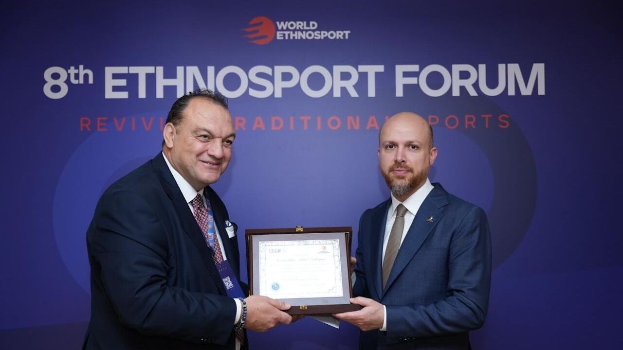 Vatan Oz/London, April 5 (AVA) – Bilal Erdoğan, president of the Dünya Etnospor Birliği, was honored with an international plaque by the Italian Sports Press Union in recognition of his efforts to preserve and promote traditional sports and cultural heritage on a global scale. The award, presented during the 8th Etnospor Forum in Antalya, highlights growing international recognition of initiatives aimed at safeguarding ancestral sports as a vehicle for cultural continuity and intercultural dialogue. The plaque was awarded during the 8th Etnospor Forum held in Antalya, an event that brought together participants from multiple countries to discuss the preservation, revitalization, and transmission of traditional sports to future generations.