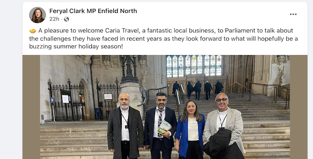 Feryal Clark MP Enfield North said: "A pleasure to welcome Caria Travel, a fantastic local business, to Parliament to talk about the challenges they have faced in recent years as they look forward to what will hopefully be a buzzing summer holiday season!"