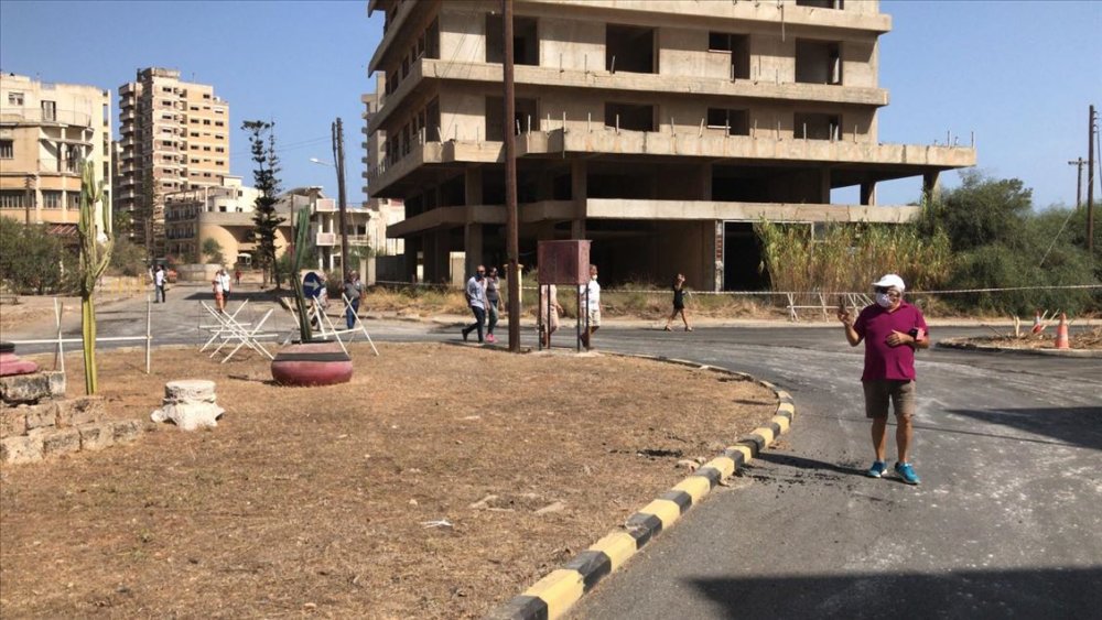 MARAS, TURKISH REPUBLIC OF NORTHERN CYPRUS-People appear at the entrance of the abandoned town in Closed Maras (or Varosha in Greek) after the city reopened for public use after 46 years in Turkish Republic of Northern Cyprus (TRNC) on October 8, 2020. Some part of the public owned beach of the town and Demokrasi Street will be opened to the public as of tomorrow morning, after 46 years. Works continue in the town, which will begin to open gradually tomorrow for the first time in 46 years. ( Muhammet İkbal Arslan - Anadolu Agency )
