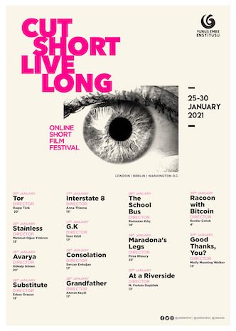 With an aim to introduce new voices alongside better-known names, as well as open doors to the wonders of Turkish cinema, we welcome all cinephiles. Films will vary in length, between 4 and 20 minutes, and topic, from unspoken injustices (“Interstate 8” by Anne Thieme on Wednesday 27th January) to bitcoin trading racoons (“Racoon with Bitcoin” by Serdar Çotuk on Friday 30th January).