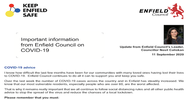 Cllr Caliskan, said: “We are at a critical point where we all need to strictly observe all safety measures. The rise in infection rates is of particular concern when it comes to those over the age of 70, those with pre-existing medical conditions and the vulnerable. That is why I took the decision to write to everyone to reiterate the simple but hugely important measures we can observe.”