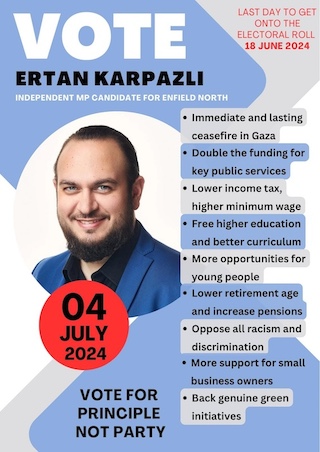 AVRUPA TIMES/LONDON-VOTE FOR PRINCIPLE, NOT PARTY! A TURKISH CYPRIOT MP CANDIDATE FOR ENFIELD NORTHIn a meeting held on the evening 29 May 2024, the newly formed Enfield Community Action Group publicly announced their backing for Ertan Karpazli, an independent MP candidate for the Enfield North constituency in the upcoming General Election, which will be held on 4 July 2024.Karpazli, 37, a London-born journalist of Turkish Cypriot origin, hopes to take the seat from incumbent Labour MP Feryal Clark, who will also be running. Confirming his candidacy after the meeting, which was held at the Darur Rahmah Hall in Edmonton, North London, Karpazli said: “It is with great pleasure that I am announcing my decision to run as an independent MP candidate for Enfield North in the upcoming General Election on 4 July 2024. This decision comes following an immense outpouring of support and encouragement from several Enfield North constituents who, like myself, have long grown disillusioned with the major political parties, all of whom have turned a deaf ear to our cries.”He added: “People who I've spoken to from all over the constituency - from Brimsdown, Bullsmoor, Carterhatch, Enfield Lock, Ponders End, Ridgeway, Southbury, Enfield Town and Whitewebbs - have all shared with me their disgust and abhorrence at the idea of an MP who is willing to remain silent in the face of blatant genocide representing them in Parliament for another four to five years.”