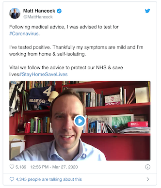 Mr Hancock said in a video message that he would be self-isolating until next Thursday. "Fortunately for me the symptoms so far have been very mild so I've been able to carry on with the work driving forward the UK response. He also said a "massive thank you to everybody in the NHS, working in social care and right across the board on the response".