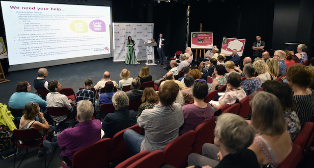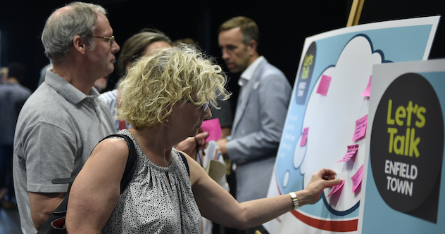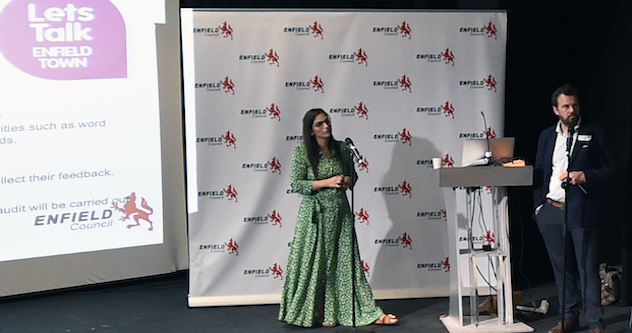 Cllr Caliskan addressing an audience at the launch of Let's Talk Enfield Town