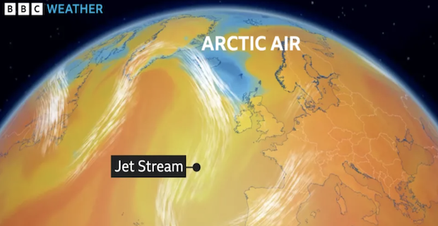 White streamlines indicating the jet stream is meandering and diving to the south of the UK.The Jet stream has been diving south in the eastern Atlantic and into central Europe