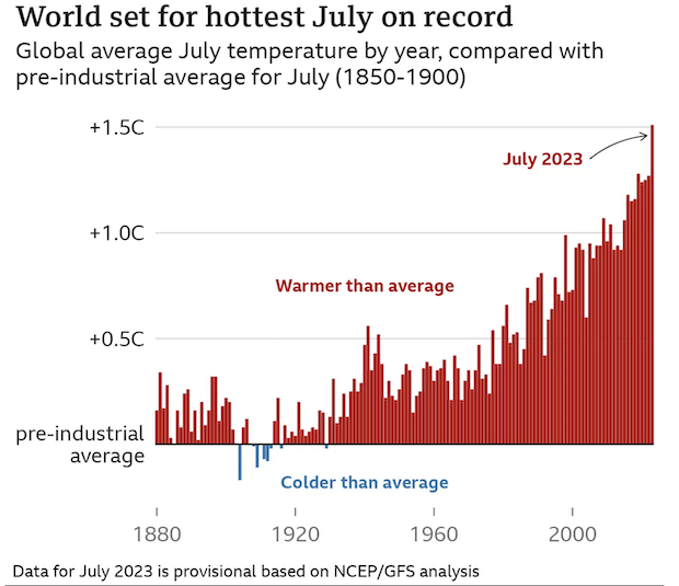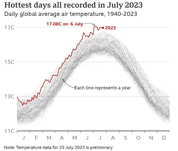 Dr Karsten Haustein from the University of Leipzig has calculated that July 2023 will be 1.3C-1.7C above the average July temperatures recorded before the widespread use of fossil fuels. The best guess is around 1.5C. He's confident that even if the last few days are cooler, the margin of error is enough to make July the hottest yet seen.