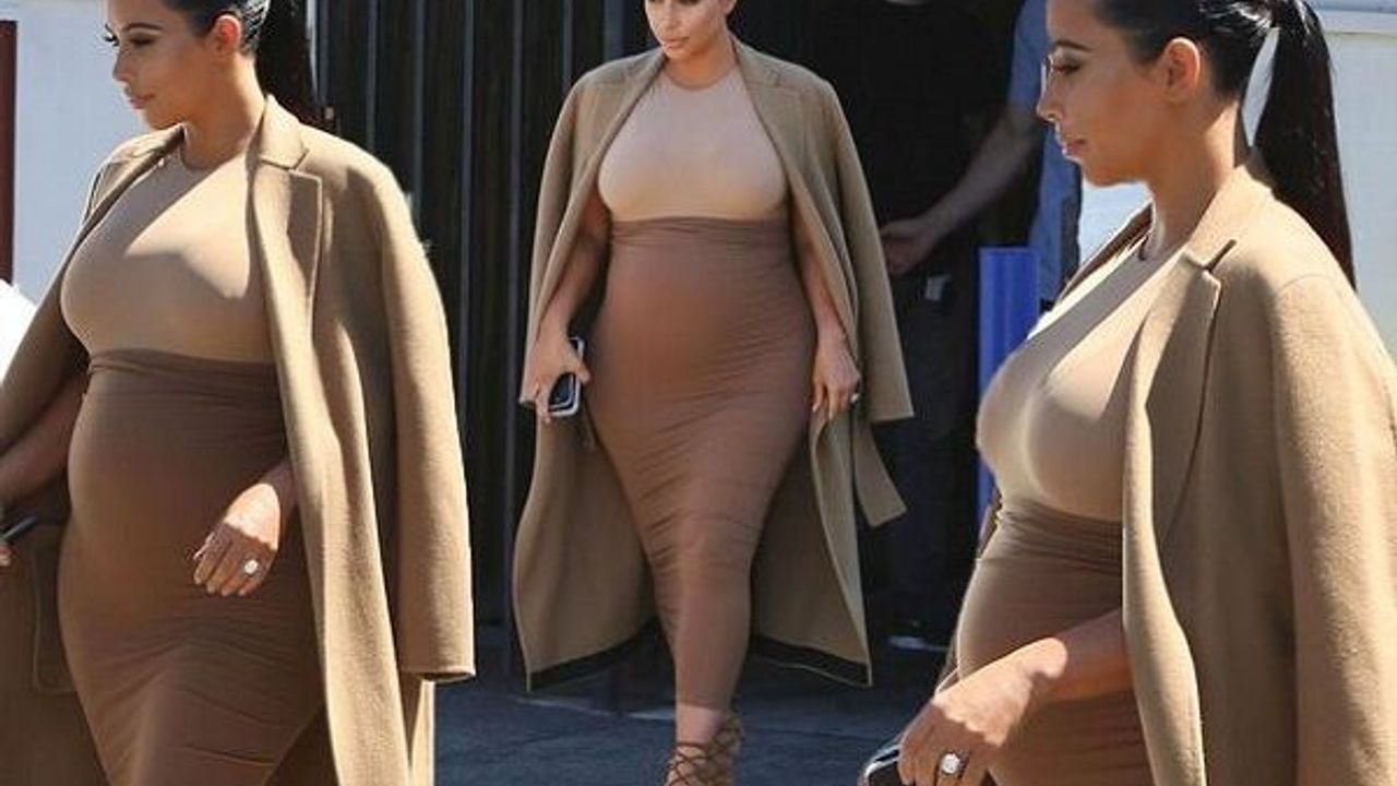 Kim Kardashian may have sparked confusion among her fans when she subtly hid her baby bump at the MTV VMAs - but it's back in all its glory just hours later. The reality star once again reached for a skintight dress in that classic maternity wardrobe, and showed off her front for all to see. Opting for a tanned floor-length dress and long jacket, she was back into work mode as she left a production office in Van Nuys, California. With her hair still scraped tightly back, and managing to wear strappy heels still, the star cut an elegant figure for the trip out.(http://www.mirror.co.uk)