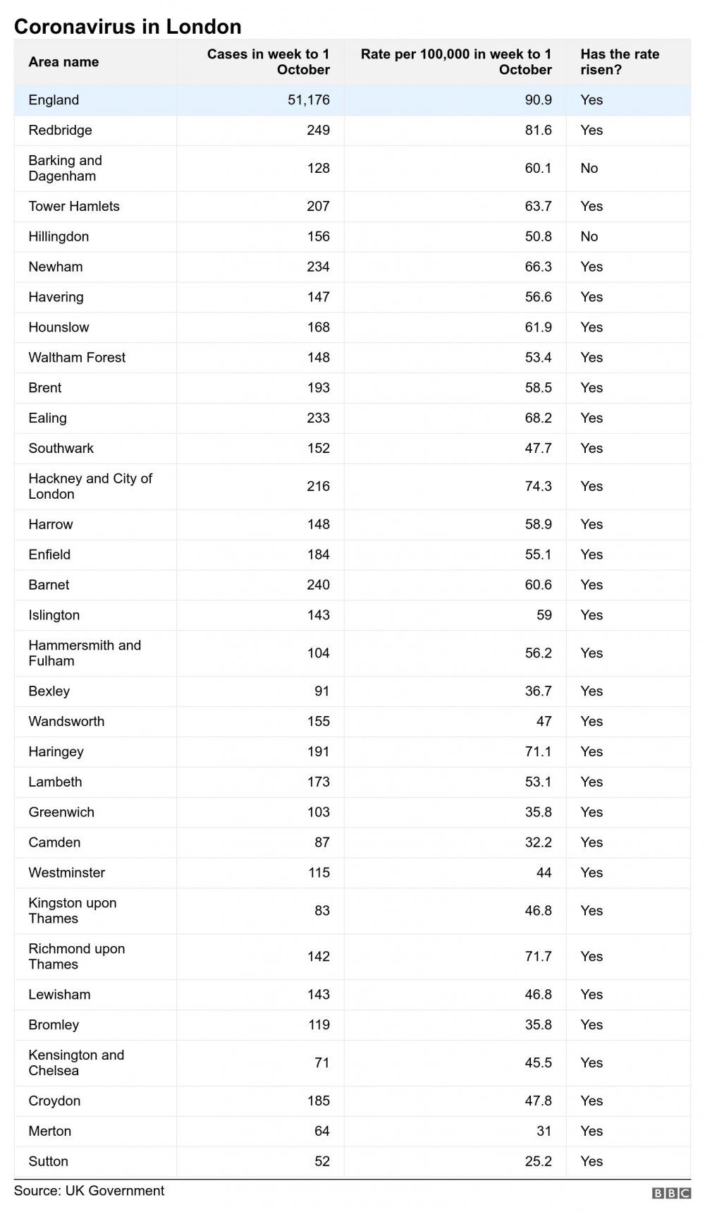 Official figures show Redbridge remains the worse hit borough with 249 people testing positive for coronavirus in the week to 1 October, with a rate of 81.6 per 100,000.