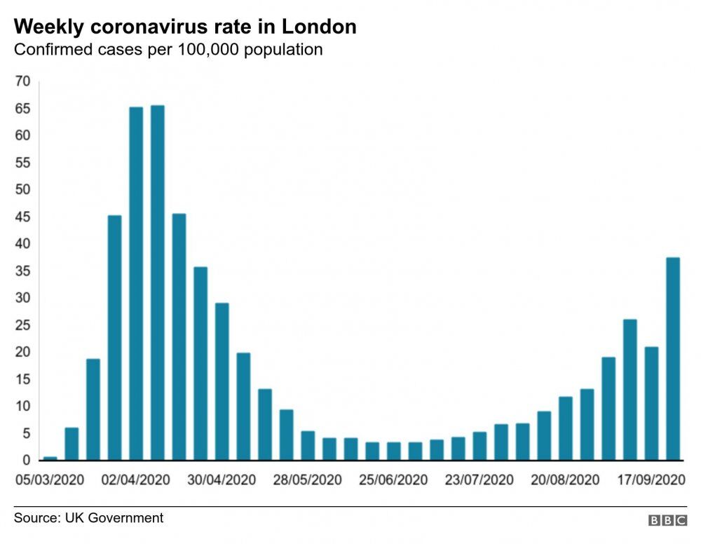 A local lockdown is unlikely to be introduced in London this week despite rising infection rates in nearly all boroughs, the mayor has said. Restrictions were implemented in several large cities like Manchester and Birmingham as Covid-19 rates increased but not yet in the capital. Sadiq Khan said the virus "does appear to be increasing" in the city, particularly in some east boroughs. However, he added levels "aren't near" those in other parts of the country. The capital has been on the national watch list for almost two weeks and the BBC has been told restrictions are to be further tightened in parts of England early next week.