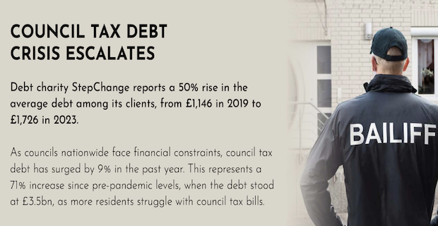 Debt charity StepChange reports a 50% rise in the average debt among its clients, from £1,146 in 2019 to £1,726 in 2023. As councils nationwide face financial constraints, council tax debt has surged by 9% in the past year. This represents a 71% increase since pre-pandemic levels, when the debt stood at £3.5bn, as more residents struggle with council tax bills. StepChange has reported a 50% rise in the average debt among its clients. With most councils increasing taxes by the maximum 5%, some surpassing this due to bankruptcy, this trend will likely persist.