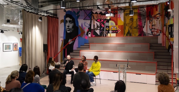 Local artist Alec Saunders answers questions from the audience about the inspiration behind his artwork at the DAC.