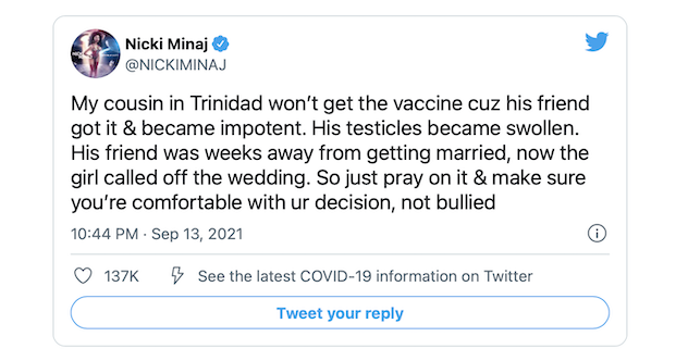 The rapper tweeted disinformation about side effects of the coronavirus vaccine - saying that when a friend of her cousin had the jab, his testicles swelled up and he became impotent.She claimed it happened in Trinidad.Health minister Terrence Deyalsingh said officials "take all claims seriously"."As we stand now, there is absolutely no reported side effect or adverse event of testicular swelling in Trinidad... and none that we know of anywhere in the world," he said in a press conference on Wednesday.Nicki made the claims on Twitter earlier this week.