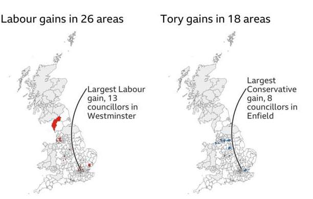 The PM visited a school in London on Friday morningImage caption: The PM visited a school in London on Friday morning.But Johnson says the overall picture is of mixed results and claims there have been some "remarkable gains"The party is also starting to show losses in Scotland, according to early results.The Liberal Democrats have gained a net 79 council seats so far - the most of any party - and the Greens are also doing well.The AVRUPA calculates that based on these results, if the whole country had voted Labour would have 35% of the vote, Conservative 30%, Lib Dems 19% and others 16%.England results are still coming in but Labour have taken three symbolic London councils from the Conservatives.Labour leader Keir Starmer hails a "big turning point" for his party - however major gains have not been made outside London.Counting has also begun in Wales and Northern Ireland.