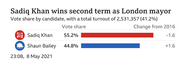 Mr Khan was seen as the favourite throughout the campaign, with some pollsters predicting he would win more than half of the first-round votes.The 51-year-old failed to reach his record-setting vote total of 2016, but won with a 228,000-vote majority.Mr Khan's closest rival was Mr Bailey, who received 44.8% of the first and second-round votes, and increased the Conservative vote share by 1.6%.