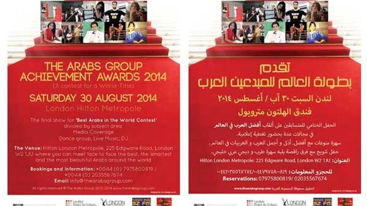 The aim of this event is to award people of Arabic origin who have excelled in their field or career, contributed to their community, achieved something in the country they live in and benefited the society and mankind as a whole. This event will also help develop a better and more relaxed understanding between our Arabic Countries and the Western World. It will also add to the beneficial creative economy for the countries involved. It is expected that this event will attract the eyes of the Arab and the Middle Eastern World to London from one side and the eyes of the Europeans to our Arab Talents and Achievements on the other. The Arabs Group are aiming to award people, companies or organisations in many specialist areas (Business, Banking, Media, Film Making, Doctorate, Science, Sport, Music, Medicine, Art, Fashion and more), who will be competing to win the prestigious and what is now considered, the international Arabs Group Achievements Awards.