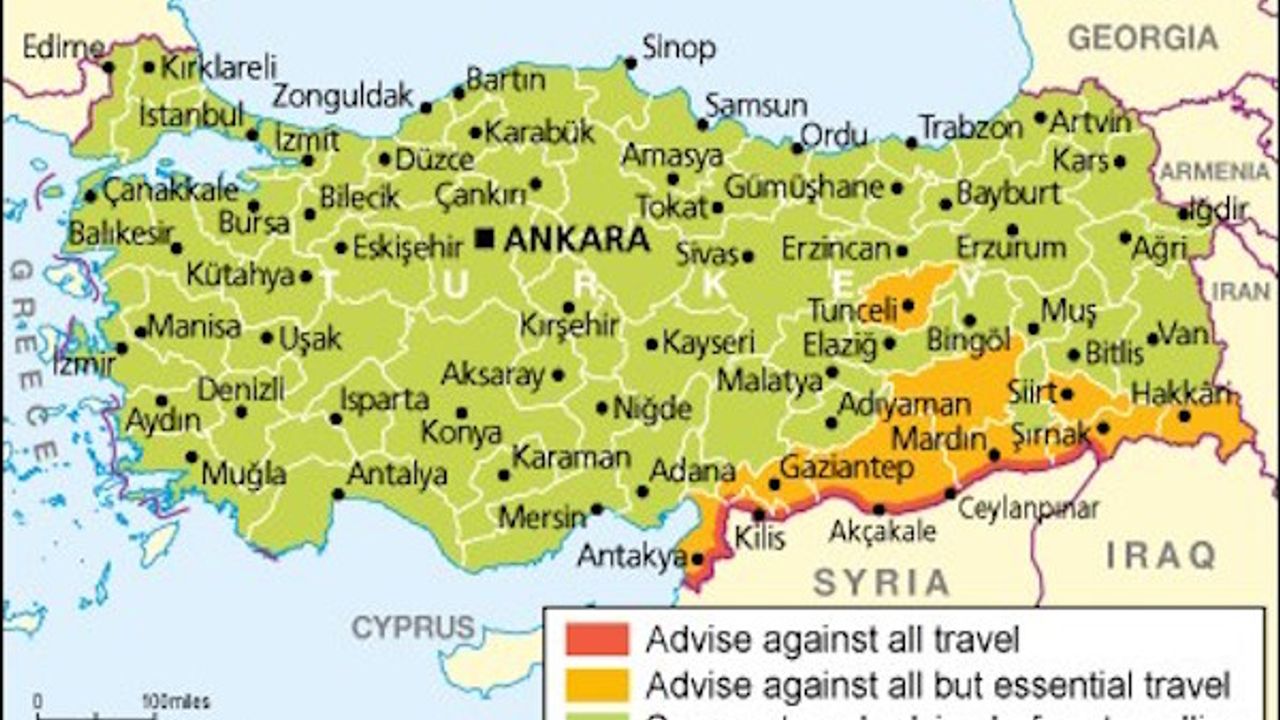 The Foreign and Commonwealth Office (FCO) advise against all travel to within 10 km of the border with Syria. The FCO advise against all but essential travel to: the remaining areas of Sirnak, Mardin, Sanliurfa, Gaziantep, Kilis and Hatay provinces Siirt, Tunceli, Diyarbakir and Hakkari provinces. There were 2 explosions near the main Ankara train station in the Ulus area on the morning of 10 October. The Turkish Interior Ministry has confirmed that more than 80 people have been killed and more than 180 injured. You should avoid any demonstrations or large gatherings in Turkey and remain especially vigilant. You should follow any instructions given by local authorities.