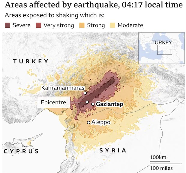 More than 4,300 people were killed and 15,000 injured in Turkiye and over the border in Syria when the quake struck in the early hours of Monday. The World Health Organization has warned the toll may rise dramatically as rescuers find more victims. As day breaks, rescue teams are stepping up their search for survivors. Many people in the disaster zone have been too scared to go back into buildings. The 7.8 magnitude tremor struck at 04:17 (01:17 GMT) on Monday at a depth of 17.9km (11 miles) near the city of Gaziantep, according to the US Geological Survey.