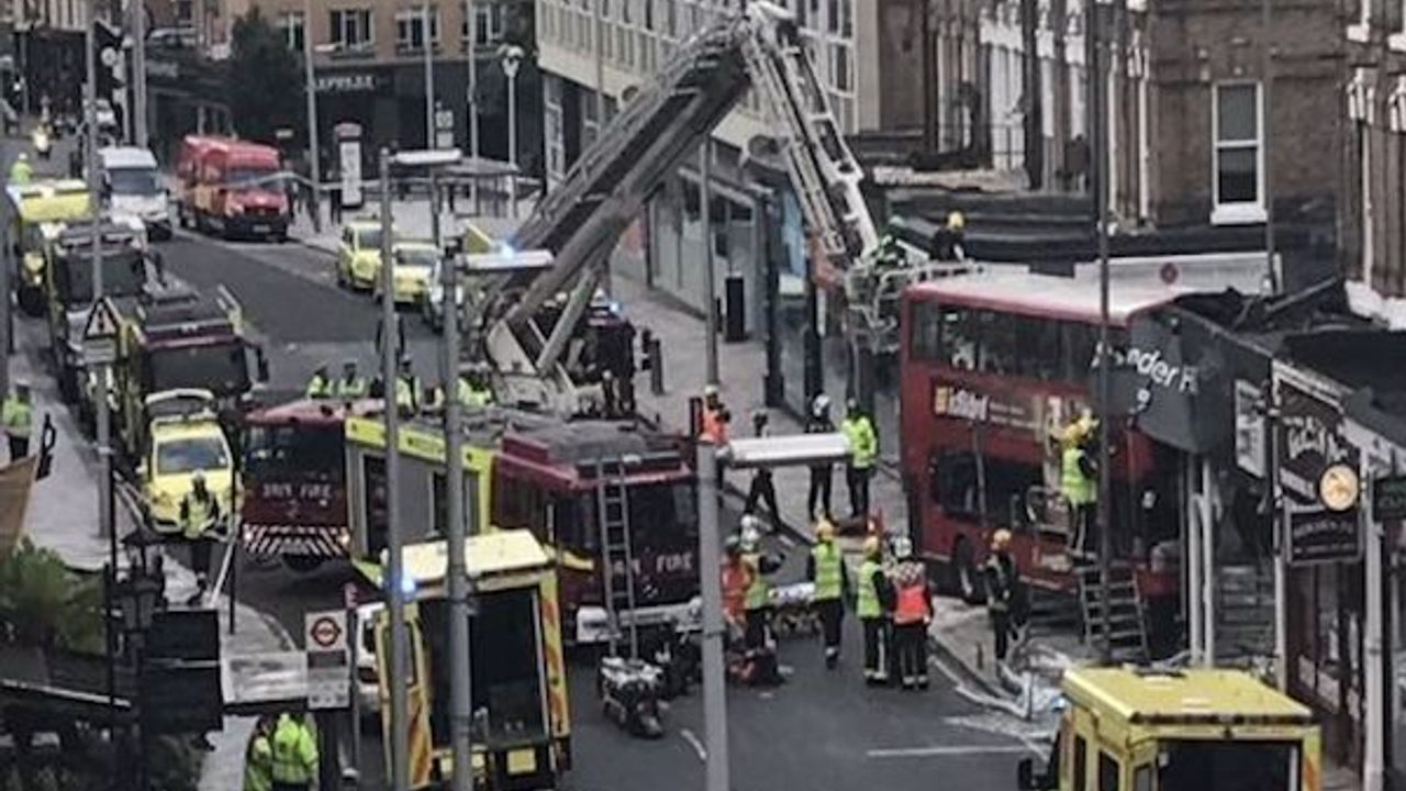 One eyewitness said he felt the bus drifting before it crashed into the front of the Poggen Pohl Kitchen Design Centre in Lavender Hill, causing the shop front to collapse. The driver of the bus has been taken to hospital. London Ambulance Service said 10 people had been treated by paramedics and three had been taken to hospital. It said it had sent five ambulance crews, two paramedics and an incident response officer to the scene at about 06:55 BST, along with an air ambulance. Andrew Matthews, 34, from Wandsworth, was one of about a dozen passengers on the bus. "I was on the top floor at the back, fortunately," he said. "I noticed the bus drifting. I heard a smash and saw the roof of the shop going through [the bus] from the front left. It went to the fourth or fifth row. "I wedged myself in, bracing myself. As soon as the bus came to a stop there was yelling, screaming. "I noticed a lady wedged in the front right-hand side. She was screaming for help. There was a lot of blood." Another passenger, nurse Amy Mullineux, 40, from Wandsworth, said the driver told her he had lost consciousness before the crash. "I spoke to him. He said he blacked out before the bus hit the shop. He doesn't remember hitting anything. "The paramedic told me they think he had some kind of fit."