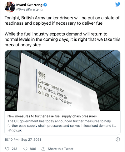 “While the fuel industry expects demand will return to its normal levels in the coming days, it’s right that we take this sensible, precautionary step. The UK continues to have strong supplies of fuel. However, we are aware of supply chain issues at fuel station forecourts and are taking steps to ease these as a matter of priority,” Business Secretary Kwasi Kwarteng said in a statement.