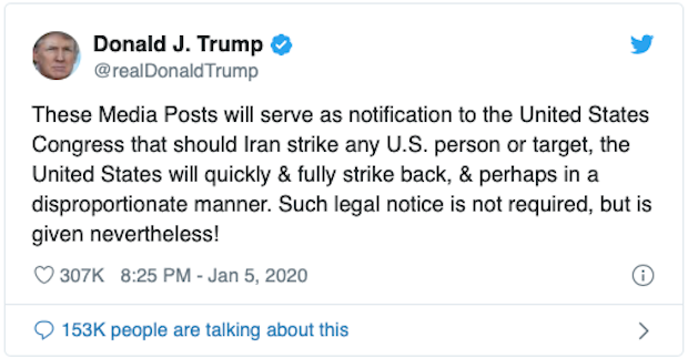 "These Media Posts will serve as notification to the United States Congress that should Iran strike any U.S. person or target, the United States will quickly & fully strike back, & perhaps in a disproportionate manner," he wrote.