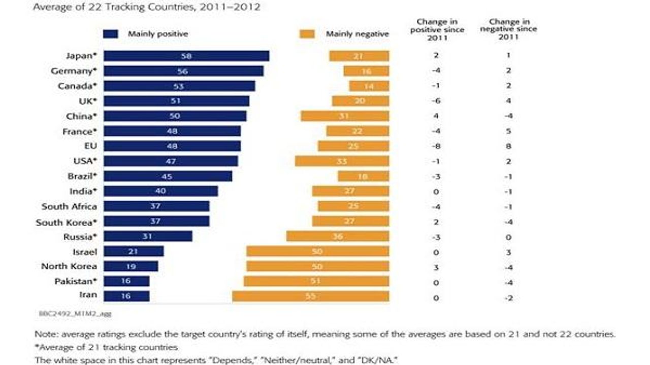 The 2012 Country Ratings Poll, conducted by GlobeScan/PIPA among 24,090 people around the world, asks respondents to rate whether the influence of each of 16 countries and the EU is “mostly positive” or “mostly negative.”