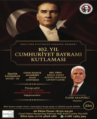 The London gala will feature journalist and TV producer Zafer Arapkirli as the guest of honor, who will discuss the historical significance of the Republic and its relevance in today’s world. The evening will include music performances by Özgür Tandoğan and Sel Trio (Saygın Akbudak, Erdal Yapıcı, Levent Caner) and a dance show by Logo Dance Academy, hosted by Tan Livaneli.