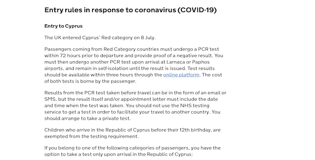 Entry rules in response to coronavirus (COVID-19) Entry to Cyprus- The UK entered Cyprus’ Red category on 8 July.Passengers coming from Red Category countries must undergo a PCR test within 72 hours prior to departure and provide proof of a negative result. You must then undergo another PCR test upon arrival at Larnaca or Paphos airports, and remain in self-isolation until the result is issued. Test results should be available within three hours through the online platform. The cost of both tests is borne by the passenger.Results from the PCR test taken before travel can be in the form of an email or SMS, but the result itself and/or appointment letter must include the date and time when the test was taken. You should not use the NHS testing service to get a test in order to facilitate your travel to another country. You should arrange to take a private test.