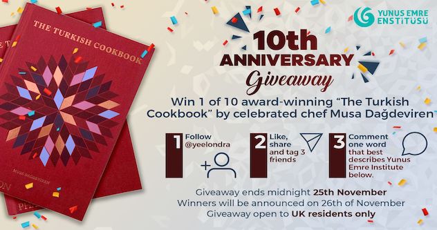 The celebration has started with the giveaway of “The Turkish Cookbook” by acclaimed Chef Musa Dagdeviren, and will continue with other offers and gifts. They will also be sharing snapshots of their many events, talks and projects on our social media pages to commemorate the many works the Yunus Emre Enstitüsü - London team have been involved with throughout its first ten years.